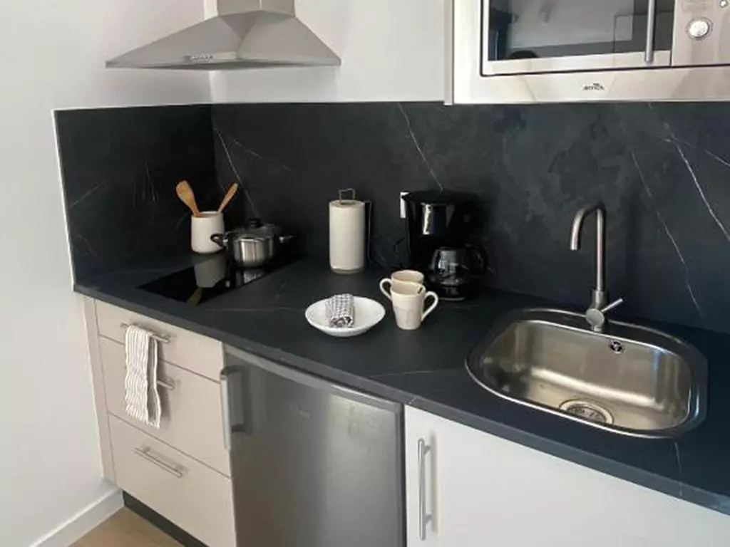 Cada allotjament compta amb una cuina completament equipada amb microones, nevera, rentavaixelles, plaques de cuina i el parament necessari per gaudir d´una estada còmoda i funcional.