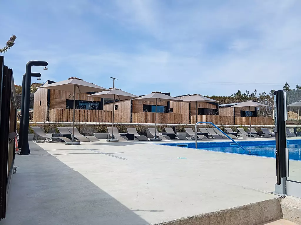 El nostre complex de cabanes de luxe compta amb una espectacular piscina exterior climatitzada , oberta en temporada d'estiu des del maig. A més, disposa de solàrium , jardins, terrassa amb vistes al mar i una pista de pàdel on jugar mentre es gaudeix del paisatge.