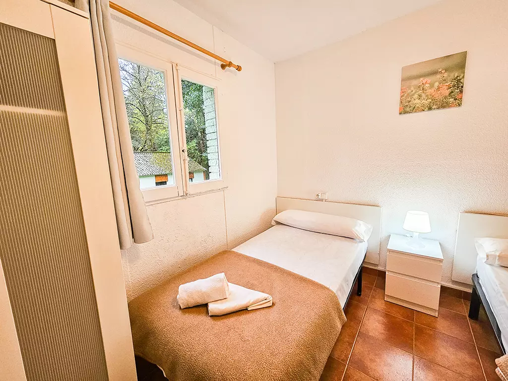 Apartaments 5/5 : Capacitat màxima per a 5 persones. Compten amb tres habitacions, dues amb dos llits individuals i la tercera amb un llit individual. Una cuina que connecta amb el saló i un bany completament equipat.
