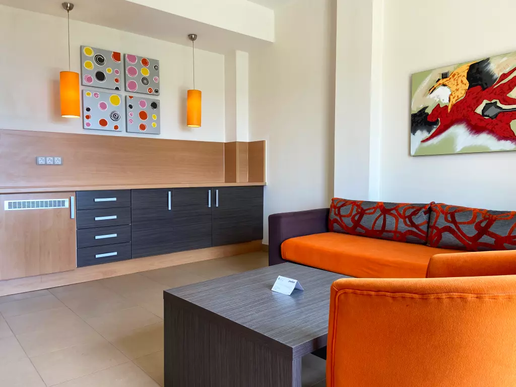 Suite Supérieure : Capacité maximale de 4 personnes (2 adultes et 2 enfants). Elle dispose de deux lits simples ou d'un lit double, d'un salon avec deux canapés-lits, d'une salle de bain complète et d'une terrasse.
